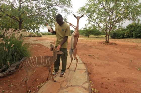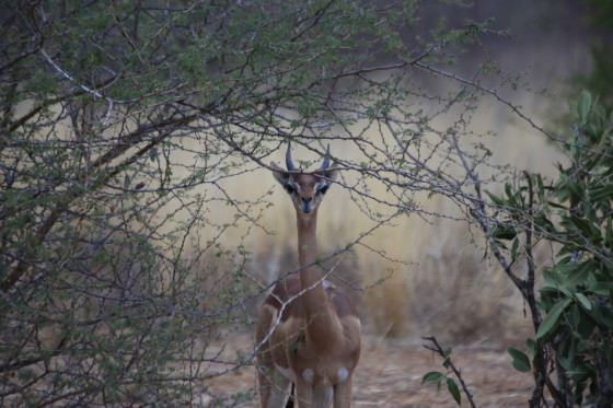 The David Sheldrick Wildlife Trust rescued an orphaned gerenuk named Nuk last year who has since rejoined the wild. He still comes to visit from time to time and in the mornings and evenings he is often sighted on the airstrip with a herd of impalas that he has taken a liking to. The Trust is holding on to hope that he will one day catch the scent of a wild female nearby and start a family of his own. There are indeed wild gerenuk nearby and it should be a matter of time before he finds a mate.