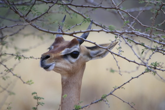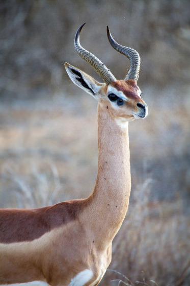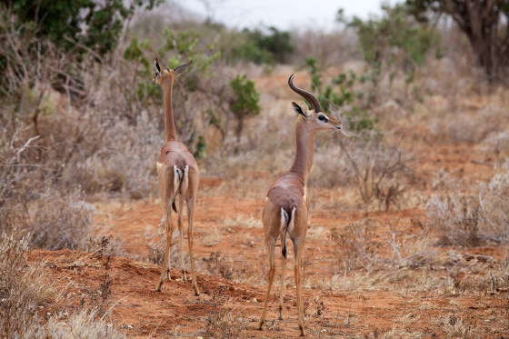 The gerenuk's large eyelashes and sensory hairs on its muzzle and ears allow it to carefully navigate through thorny bushes without getting scratched. In addition to having an extra long neck it is also able to stand on two legs and reach even further to the tops of shrubs and bushes. This is facilitated by stronger-than-normal lumbar vertebrae and powerful hind legs. This way they can reach tender shoots up to six and a half feet off the ground. The name Gerenuk is of Somali origin, meaning giraffe-necked. They are found in Somalia, but also in southern Djibouti and much of Kenya's arid North as well as throughout Tsavo in the East. Aerial surveys have shown that their densities are higher in drier areas and especially in areas further from permanent water sources. This way they reduce competition with other browsers that are more water-dependant.