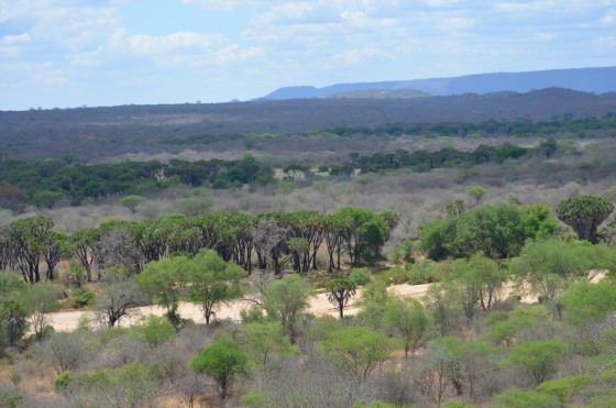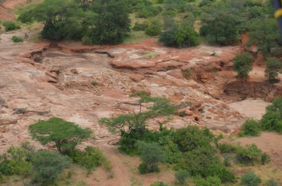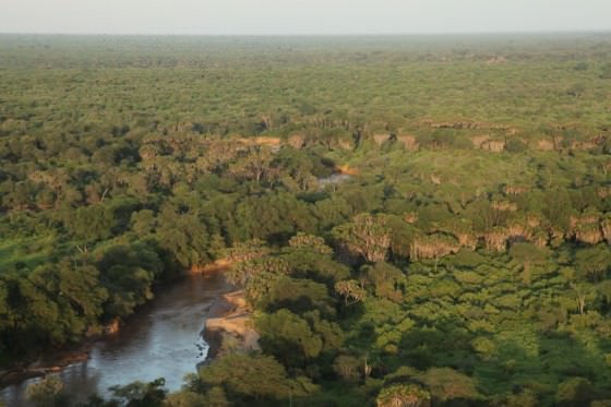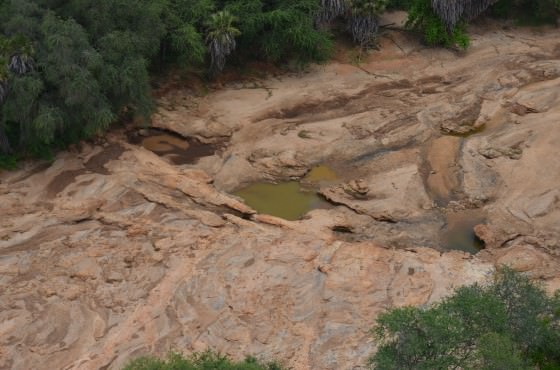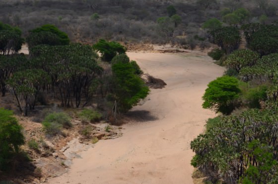 Inside the Park, the Tiva River flows south along the edge of the Yatta Plateau until it suddenly turns east, cutting through the flat, barren landscape that characterises the North of Tsavo. Generally, it winds around long, lazy bends, but in one place it drops over a set of falls known as Bisadi.