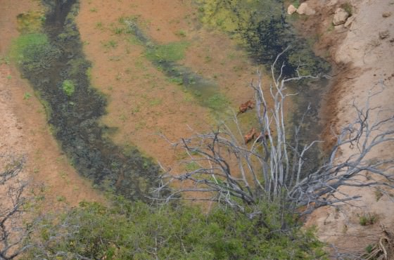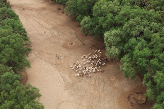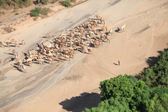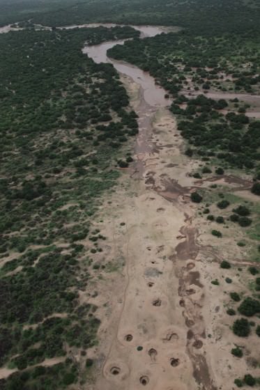 Towards the edge of the Park the river abruptly dissipates into an expansive, green delta where animals congregate to graze on fresh vegetation. The area surrounding the delta has also been home to nomadic, Orma pastoralists since antiquity. In an old stretch of the river that lies beyond where much of the current river is unloaded into the delta, they follow the elephants' example and dig hundreds of deep pits in the sand known locally as Ndiandaza wells. From these wells they are able to keep thousands of cattle, sheep, goats, donkeys and camels alive year round.