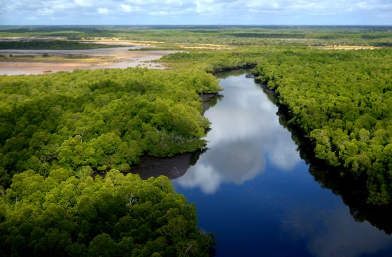 From the air, the mangroves provide rich contrast against the snaking tributaries that reach inland. Sending roots directly into sea water they leave little room for beaches, but instead hang over the water casting dark shadows.