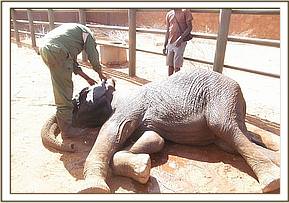 Once the team arrived on the scene they estimated his age to be anywhere between six to seven years of age, and he was extremely immobile with fluid dripping from his trunk and mouth. The decision was made to anesthetize him for a closer examination and then load him onto the Trust’s Canter truck to transport him to the stockades in Voi for close observation and supplementary feeding. However, implementing a plan like this took some doing, as lifting and loading a six year old elephant is no easy task. It was soon ascertained that he certainly had some broken ribs and there was the possibility of sinister internal injuries too. The team cleverly enlisted the help of the workers based at Chinese Depo for the SGR Railway and man power loaded the recumbent calf onto the back of the canter for the drive the 60 Kms to the Voi stockades, with Dr. Poghon and some of the SWT elephant Keepers keeping a close eye on his condition throughout the journey. Only once he was safely laid down in a stockade at our Voi Rehabilitation Unit did Dr Poghon reverse the anaesthetic.