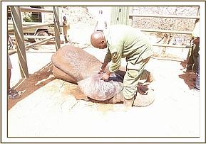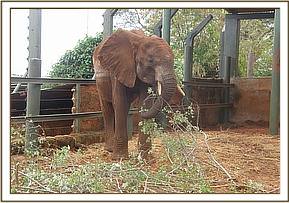 This was a most encouraging sign and gave us all renewed hope. Even the next day he fed well, and all the while new and varied browse was placed in his stockade, along with water and soft earth and mud for him to enjoy. But then the following day he was standing still, head hung, fluid still coming from his mouth, with a complete lack of appetite. He was given more anti-inflammatory drugs via pole syringe and again perked up once the pain was lessened. That thankfully was the last day he showed these signs, since then he has fed well, calmed down enormously and is healing well. We were confident that with tender loving care we would be able to save Ajali.