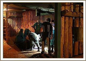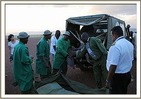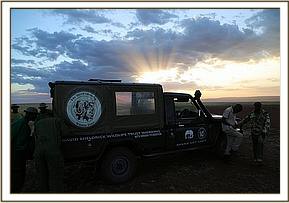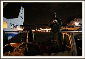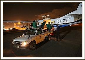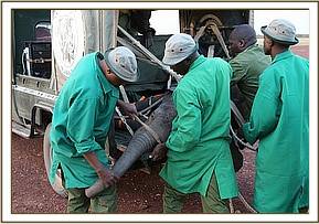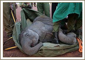 Wasting no time, and aware of the late hour Angela coordinated the rescue mindful that another night alone would leave him vulnerable to the Mara’s many predators and could prove fatal. The SWT Team was hastily scrambled from Nairobi, and in the meantime the SWT/KWS Mobile Mara Veterinary Unit and Dr. Limo headed to where the calf was last seen. With time running out, and no elephants in the area the SWT/KWS Mara Veterinary Team together with the Mara Conservancy rangers captured the approximately fourteen month old calf. This proved to be no mean task, because despite being injured he remained very strong. After a Herculean effort the team were able to restrain him and load him into the back of the Veterinary Unit land cruiser and drive him to the Serena airstrip to wait for the SWT Keepers and rescue aircraft to land.