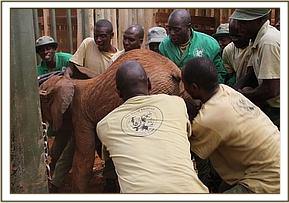 A SWT vehicle was waiting at the airstrip and the calf was soon on her way to the SWT Nairobi Nursery in Nairobi National Park. At 2.30pm she had finally reached her final destination and was carried into her stockade. After untying her, the Nairobi Keepers carefully lifted off the blanket covering her face, which was keeping her quiet and calm, and helped her up. Unsteady on her feet she dazedly stood in the shade of her stockade eyeing the humans surrounding her warily yet being too tired to fight them off, she seemed to know she was in a safe place with caring people to look after her.