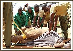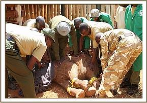The entire stockade’s workforce and the Nairobi Keepers were all needed to help to get the new arrival restrained and on the ground in order to brace her legs and keep her safe and secure during the flight. With all hands on deck the calf showed huge amounts of strength in managing to evade being taken down, yet after a few minutes she succumbed to the keepers, whilst ex-orphan Emily bellowed and stomped around the stockades concerned about what was happening to her.