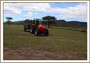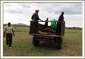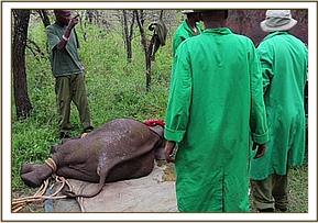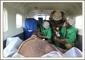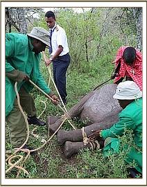 Our rescue team landed at the airstrip close to the camp and was transported to where the elephant was by the lodge staff. The capture was dramatic as they had to restrain her with their usual technique of a blanket thrown over the head and then restraining her behind the ears and neck. They tranquilized her at this point to reduce the stress levels, but it became evident she was too large to fit in the lodge vehicle to be transported to the airfield. There were many people present assisting in the rescue of this 18 month old baby and the lodge staff provided enormous support and assistance, providing a tractor and trailer to transport the calf back to the waiting plane so that she could be loaded, strapped and secured and placed on a drip for the duration of the flight.
