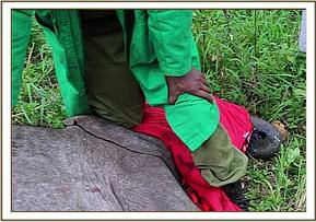 However, the drama concerning Asanje was not over. As the weeks passed she grew stronger and joined the orphans out in the bush becoming comfortable with the routine and making new and special friends with many of the elephants in the Nursery. But just when we thought all was well, early one morning while out in the forest with the others Asanje suddenly swelled around her neck and chin, grew weaker and weaker, circling around in one direction and seemingly lost her sight. It took many men to guide her back to the safety of the stockades. Edwin immediately reported Asanje’s deteriorating condition to Angela who ensured that she was given cortisone intravenously to save her life. Clearly she had suffered a monumental anaphylactic reaction to something, something that remains to this day a mystery but we suspect it could have been a cobra snake bite. She was placed on a drip to restore her strength and as the day passed grew stronger, the swelling subsided and she began to feed once again.