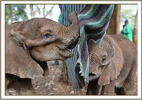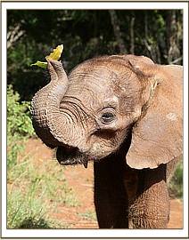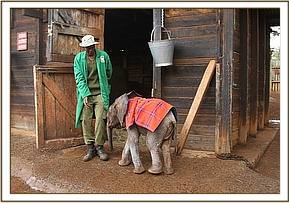 Right from the outset Ashaka has been full of boundless energy. We estimated her age on arrival to be around the three week mark as she came to us still without teeth. Ashaka being so young seemed not to miss her elephant family and adapted to her new environment quickly , soon becoming totally attached to both her Keepers and her milk bottle. A hanging comfort blanket has given her endless hours of enjoyment out in the forest and in her night stable which she shares with an elephant Keeper each night, receiving milk 3 hourly 24 hours a day. She loves to wriggle her trunk around it, resting on it, and taking her milk from under it. Her stable is next to Kamok's, and she spends her days in the forest with her tiny elephant friends as we have a few babies her age at the moment.