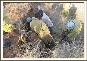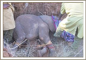 Several hours passed with no sign of the calf’s mother. The Galana Conservancy scouts saw the calf disappear into a nearby bushy area and hoped for the best. He was however sighted the following day desperately looking for water; staying in the area for over two hours while taking refuge from the merciless hot sun by resting under an acacia tree. He looked thin and drawn and cut a tragic figure and it was clear he would not survive without intervention.