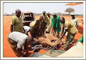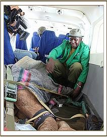Having spent the night at the Voi Stockades, the yearling orphan named Bomani, the name of the area where he was rescued, was airlifted to the Nairobi Elephant Nursery the following morning (21st July 2012) an event filmed by an NBC team, who were in Nairobi filming the Trust's work presented by Chelsea Clinton. The other orphan rescued that day from Mgeno Ranch was a 2 year old female who remained at the Voi Stockades, and everything that might be needed for her recovery was flown down in the plane that was sent to airlift little Bomani back to the Nursery, as given her age she will be raised in Voi to join our older orphans there. She was called Panda, named after the raised outlook where she was rescued.