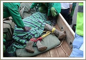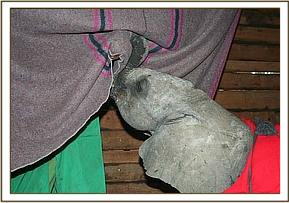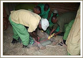 The Ranch workers monitored the lone calf for the rest of the day, but there were no other elephants to be seen in the area, so as nightfall approached, Alistair Boyd, the manager of Loisaba lodge, decided to save the elephant baby. With the help of his Staff, he managed to overpower the calf, who was still sufficiently strong to put up a spirited struggle. However, once subdued and tied down, he was taken to the Ranch Headquarters, where he took water from a bucket, and was given an Attendant as company for the night. It must have been a pleasant surprise for the little elephant to find a human who was caring and friendly, who offered him greens and water, and communicated with him in a gentle voice. He responded, and calmed down.