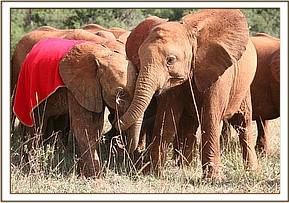 He was found near a small spring on the Ranch boundary, and was given the name “Chemi Chemi” which is the Swahili word for a Spring, since the Samburu or Pokot tribal name for a Spring was too difficult for most people to pronounce correctly. Little Chemi Chemi, or Chem Chem for short, who is approximately eight months old we think settled in instantly, especially when he found Melia next door to him. The very next morning he was allowed out to meet all 19 Nursery inmates, who embraced him instantly. From the start, he took milk from a bottle gratefully, attended the noon mudbath, which he enjoyed immensely, and clearly loved once again being part of an elephant herd, albeit one of miniatures. Olare, who has the makings of a very caring and proficient little Matriarch was, and is, exceedingly protective of him, and being of Northern elephant stock, where the population has been distilled until only the fittest have managed to survive, he will make a wonderful addition to our orphaned herd.