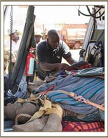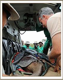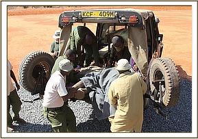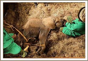 The SWT/KWS Tsavo Mobile Veterinary Unit were immediately alerted and rushed to the scene. Thankfully such prompt response managed to ensure the calf was placed on an IV drip while the SWT helicopter was mobilised to fly directly to Voi from the Trust’s Kaluku field headquarters in order to transport the calf directly to the Nairobi Nursery saving precious time. It was this rapid response that ultimately saved this little calf’s life, because in cases of drought and starvation, every hour counts.