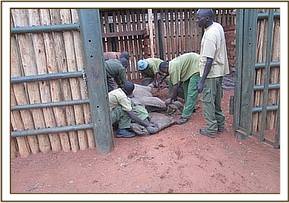 Little Emsaya as she was called, had obviously been without her family for awhile for she was gaunt and thin, aged approximately two years old, alone and vulnerable. The rescue team arrived in the afternoon, and was immediately shown to the Galana River’s banks to where the young calf was browsing. Rescuing a calf this size, even when thin and weak, is not a job for the faint hearted and it took brave men to chase into the bush after her to do so. Eventually she was restrained, her legs strapped and she was lifted into the Trust’s pickup vehicle. It was decided by both Angela and Daphne that she would be taken to the Sheldrick Wildlife Trust’s Voi stockades, to join little Kivuko rescued just a few days before, as both calves are just over two years old. Although both still milk dependent, remaining in Tsavo with our Voi adolescent orphans seemed like a good option, and after a two hour drive she was safely delivered to the taming stockades there.