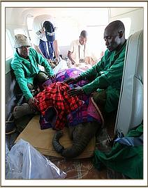 She was given 20mgs Dexamethasone sodium anti-inflammatory intravenously and another 20mgs intramuscularly to ease pain and avoid shock but by the time she was on the plane the baby elephant was again fully conscious in transit. Of course taking a calf from its mother is never a decision taken lightly by the Kenya Wildlife Service, but it was felt that there was little option if this baby was to remain alive with an intact trunk.