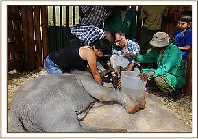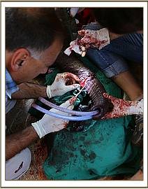 The following day, a three hour operation was performed with three Vets in attendance in order to stitch together this little calf's trunk. The operation went well, but despite being heavily sedated for the days afterwards, she set about trying to dismantle all the painstaking stitching that has been done. An elephant's trunk is said to have 40,000 muscles, divided into as many as 150,000 individual units, and the constant contracting, expanding, wiggling and squirming, makes it very challenging to keep sutures in place.