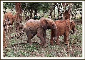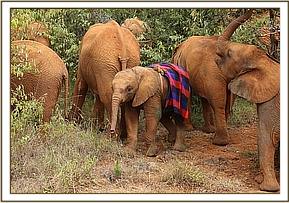 While Godoma, despite her injuries, did well physically, she has missed her lost family terribly and has taken a long time to settle and comfortably integrate into the Nursery herd. She has been shy and reserved, remaining on the fringes of the group, but with the resident orphans giving her constant attention we have watched her change and grow more comfortable. In the beginning the first stable we placed her in caused her great anxiety. She felt claustrophobic, but when we changed her stable and placed her in one with a higher roof and more space, Mwashoti’s stable, she was instantly more comfortable. Thankfully mellow Mwashoti had no problem with the stable change.