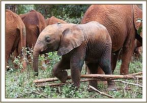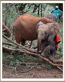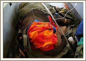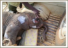 Simultaneously a rescue aircraft was mobilized from Nairobi and our Nursery Keepers prepared the necessary rescue paraphernalia. The two teams met at the Taita airfield and handed over their precious cargo. The female calf was carefully prepared for her flight with an intravenous drip inserted into her ear vein before take off. It was close to nightfall by the time she arrived at the Nairobi Nursery with a carefully prepared stable awaiting her arrival. She cried much of the night, missing her lost family enormously but with the reassuring company of the rest of the Nursery orphans along with loving tender attention from her keepers she eventually settled. We have called her Godoma, the name of the valley close to where she was rescued, and we estimate she was about five to six months old on arrival.