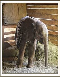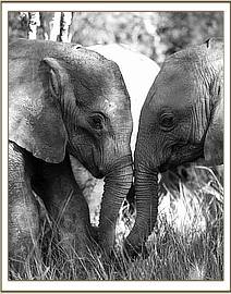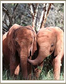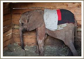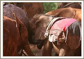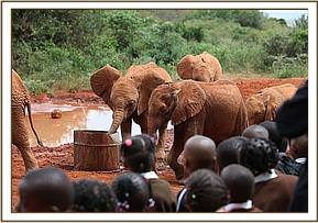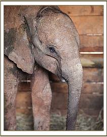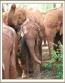 Initially she was extremely wild and certainly did not let anyone close, not even to take water or milk. But with gentle and tender company throughout the night she succumbed to her hunger and eventually took both milk and water by bottle from the Keeper in the early morning hours of the next day. As is so often the case with starvation victims, once she started taking in food she collapsed in a shivering state, and that familiar dread crept over us all as we wondered whether the events of the past week had proved too much for her. But after injections of Selenium, Vitamin B12 and being on an intravenous drip for two hours she eventually struggled back to her feet much to everyone’s delight. That afternoon, despite being so weak, we bought the other orphans to her stockade and they enveloped her with love that fueled a Will to Live. She left the confines of the stockades following them into the bush, and instinctively the orphans knew not to venture too far afield. This whole experience seemed to do the trick. The next morning she joined the group, and even ventured to the midday mudbath, and despite the visiting public, for that hour surrounded by the others she seemed totally calm.