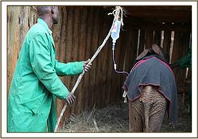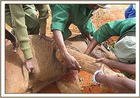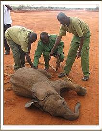 Ishanga was rescued literally from the jaws of death. Not only was her condition very poor, as she had obviously been without Mum for many days, but just as the team who had sighted her all alone during a routine patrol, circled to capture her, a lion leapt out of the undergrowth and grabbed the vulnerable elephant baby by the neck. This most unexpected twist to the rescue caused enormous panic, and in the scramble the KWS ranger managed to fire gun shots into the air, and very fortunately the lion let go of its prey.