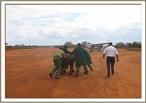 She was driven to the Maktau airstrip in the Ziwani antipoaching team landrover, where the team waited with the baby until the rescue plane and Nairobi Keepers landed. She was immediately prepared for the flight and after an hour plane ride brought straight to the Nairobi Nursery.