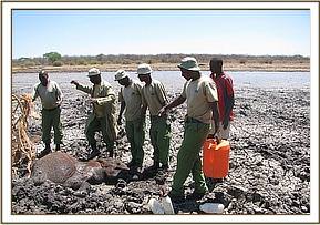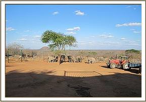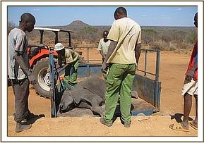 Having mobilised all available Keepers, the calf was pulled free of the mud, and with her legs bound, she followed the Keepers to the airstrip situated close by and into the shade of the open aircraft hanger. Once it was established that the decision had been made by Daphne and Angela for the calf to remain at Ithumba to be raised, in the hope that she may later be united with her mother and herd, she was lifted onto the tractor trailer and driven from the airstrip to the Ithumba Stockades, a short five kilometre journey only.