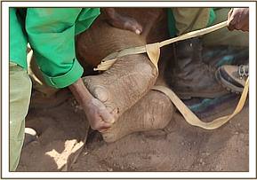 Awaiting the rescue plane at the airstrip was one of the ATE’s staff, who quickly transferred the team of eager Keepers to the site of the orphan. A short ten kilometres from the airstrip, having passed a host of wildlife, the ATE field team was soon spotted on the side of the road, keeping an eye on the young elephant they had found that morning. After greetings were made and the ATE staff briefed the Keepers, the quick decision was made for the four SWT Keepers to approach the calf Jasiri on foot, who was standing quietly in the shade only thirty metres away from the vehicles at the edge of a bush. With ropes and blankets in hand the Keepers slowly approached the baby elephant, who eyed them suspiciously, yet made no effort to move. Moving ever closer the team reached about ten feet away from the calf before he suddenly got frightened, charged aggressively at them a couple of times, the Keepers holding ground, before he ran off away from both the vehicles and the ground teams. Despite clearly having energy and strength the calf wasn’t able to outrun the Nairobi Keepers who were hot on his tail. Chasing the baby for about fifty metres the Keepers, perfectly in unison, ambushed the calf, each Keeper seizing him as smoothly as possible from every side, holding him firm until the rest of the backup teams reached the calf, with joint strength everyone managed to bring the calf to the ground in order to bind his legs and keep him from escaping or hurting himself.