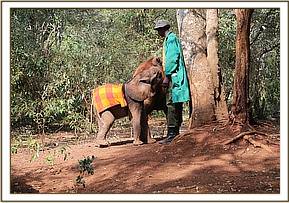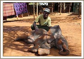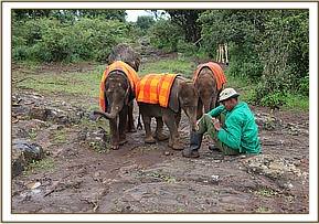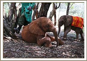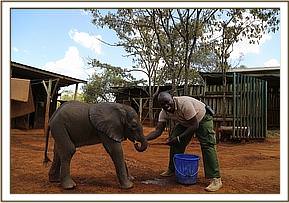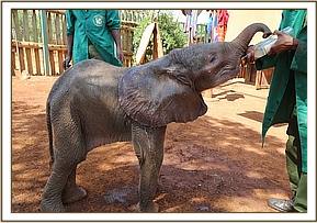 On arrival at the Nairobi Nursery, he was cooled down with water and a mud bath, and fed rehydration mineral water along with milk formula, which he drank enthusiastically since he was obviously extremely thirsty. Of great concern was the fact that his digestive system was in disarray since he was passing liquid mud, combined with the fact that he had no teeth so we were mindful we still had the dreaded teething process to go through, something that is very often accompanied by fevers and serious diarrhea, which orphaned elephants are prone to with their natural elephant stomach flora compromised due to the change of milk.
