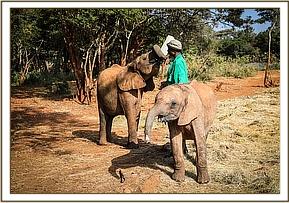 Musiara putting his trunk in Jotto's mouth
