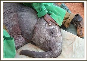 The baby elephant was fed milk and rehydrant by the Trust’s Keepers before being airlifted to Nairobi lying with its legs bound on the rescue tarpaulin in the back of the Caravan aircraft. She arrived in the Nursery at 4 p.m. and was named “Kalama”. She was in good condition, and very calm, following the Keepers, so she was taken into the bush to join the other small Nursery babies for the rest of the afternoon. However, she was very restless and psychologically disturbed during the night, attempting to climb the stable partition, and calling continuously for her elephant mother. By dawn the next day, she was much calmer and more resigned to the circumstances in which she now found herself. Being a well victim, she need to undergo a long course of injectible antibiotic to forestall the dreaded pneumonia, but unlike many of the others who arrived severely emaciated, this calf had some reserves so we are hopeful that she will thrive.