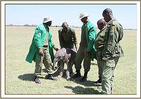 We immediately mobilised a rescue team and flew to Ol Pejeta, a 40 minute flight from Nairobi. The calf was already waiting for the rescue team on the Ol Pejeta airfield having been transported there from Kiparo boma by Ol Pejeta Scouts. The Keepers wasted no time in giving the hungry baby a bottle of milk and then prepared her for the journey home, ensuring that she was placed on a drip for the duration of the flight to boost her strength further.