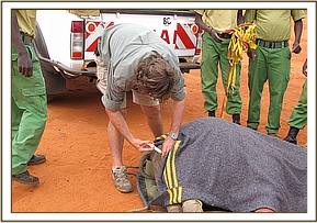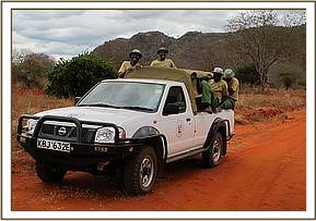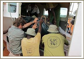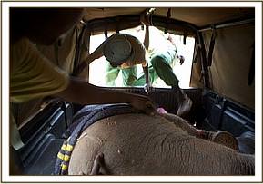 Meanwhile about six of the most experienced Elephant Keepers from the Trust’s Voi Rehabilitation Centre were brought in, the fact that an Elephant Rescue could be imminent having been reported to the Kenyan Wildlife Service. Time was now of the essence. The Veterinary Unit vehicle carrying the Keepers drove in tandem with Robert Carr-Hartley's landrover and together they drove determindly into their midst. Taken entirely by surprise, and not accustomed to such effrontery, they took to their heels, leaving just two or three around the calf, who had been left behind not able to keep pace with the fleeing adults. Ignoring the threats of the baby’s remaining Protectors they managed to separate the calf, and steer it towards the Pickup carrying the Keepers. The Protectors lost their nerve at the last minute and decided that discretion was the better part of valour, leaving the yearling calf to its fate.