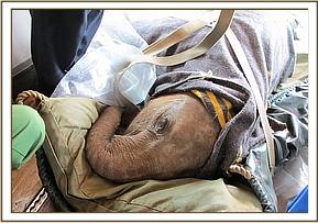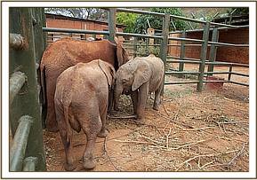 Instantly the Keepers leapt from the Pick-up carrying them, and threw a blanket over the calfs head and eyes as they moved in to overpower it and grapple it to the ground. The baby was approximately a year or just over, and not as strong as he should be were he well fed. Soon, he was held on the ground, and his legs were bound with special strapping before rolling him over onto the rescue tarpaulin and heaving him up onto a mattress in the back of a Pickup vehicle to be driven to the Voi Stockades. Overnight he was in with Kenia and little Kimana, adjacent to the other 13 orphans currently in the process of rehabilitation at the Voi unit’s base. Kenia is a very gentle and caring ex Nursery Matriarch, and Kimana the smallest elephant at the Voi Stockades, although not the youngest, who adores her and suckles her ears constantly. The newcomer was careful to squeeze himself between the two, and when they took their milk, he also decided to do the same, as long as he was in the middle and as such not exposed to a human!