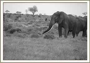 The following day on patrol the mobile veterinary unit came across the same bull together with a herd of handsome bulls. He was amazed to find so many handsome bulls all together in one large grouping, with no female herds anywhere in sight, and even more surprised to spot amongst them, looking miniscule, a tiny yearling calf, quite obviously an orphan whom they were protecting from predation.