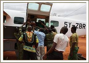 The Rescuers converged on the area where the calf had last been seen, and managed to locate and capture it. It was a young bull aged about 2 ½ years with short tusks, but weakened through milk deprivation. Once it’s legs were bound, the trunk wound which was deep and suppurating, was hurriedly cleaned and the calf given a long acting antibiotic before being driven to the nearest airfield to be airlifted to the Trust;s Nairobi Elephant Nursery. It arrived just after noon – a young 2 ½ year old who has been named “Kasiagau”.