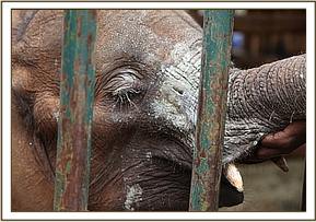 Apparently, it had been seen attempting to attach itself to several wild herds, but had been repeatedly rejected, until in desperation it came to the Lodge in an emaciated condition seeking human protection and, hopefully, help. It was obviously an orphan, aged about 2 years, believed to be another poaching victim who had obviously been without its mother for some time. It had a deep arrow wound in the top of the trunk.
