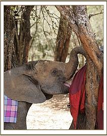 The elephant calf is a little female, roughly 8 months old and our Keepers decided that she be awarded the name 'Kenia' (spelled differently to the country name to avoid confusion with our website's automated search function) to mark the successful outcome of mediation by Mr. Koffi Annan which hopefully will restore peace following the disputed Presidential elections of last year. Tribally driven unrest due to alleged vote rigging has cost the lives of hundreds of Kenyans and displaced thousands of others. Most Kenyans are shell-shocked by what has taken place in their country which has been stable, democratic and peaceful for over 45 years of independence and which has always been the Show Piece of Africa. Resolution of the crisis took place a couple of days before the latest orphan was brought and it generated a carnival atmosphere. So in celebration of an anticipated return to normality among all the tribes that make up the population of Kenya, and fittingly too as she comes from the forests of Mount Kenya, we chose the name Kenia.