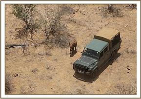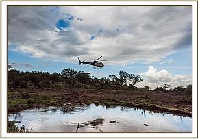 KWS Vet Dr. Poghon was collected by Neville and flown from the Voi headquarters to the closest airstrip, this was however quite a distance from where the trio of elephants were on the southern bank. On arrival they were met by Andy in the helicopter and flown to where the Mtito Team with their vehicle waited for guidance from the air. Dr. Poghon agreed that without a rescue this young baby would not survive, but first flew around to confirm once again that there were no other elephants within the area.