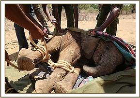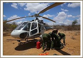 Given the open terrain it was not difficult to gently separate the bulls from the baby with the helicopter so that our ground team could drive up to the baby and capture her safely. She was still strong, but little time was wasted while they prepared the stretcher and tied her legs so that she could be safely loaded into the helicopter and flown directly to the Trust’s Nairobi Nursery. With the back seats removed there was ample space for the calf and a team member to sit in the back of the aircraft offering her comfort throughout the one hour flight.