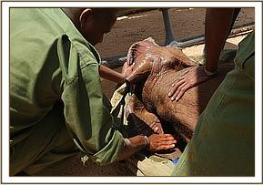 GPS coordinates of the location of the two bulls and baby were shared while Neville continued on to complete his patrol in the south where the drought had really taken hold, with numerous elephants dying as a result of a lack of food due to failed rains. It was confirmed that they were indeed two bull elephants with a tiny baby and that there were no females or other elephants in the area. Neville coordinated with KWS Veterinary Officer Dr. Jeremiah Poghon working with the SWT funded Mobile Veterinary Unit based in Tsavo, to be flown to the closest airstrip which was in fact on the north bank of the Galana River. The Trust’s Mtito Desnaring team which works together with KWS was directed to the location as well.