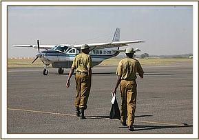 The elephant Keepers going on Kibo's rescue walk across the apron on the airfield to the waiting plane to fly them to Amboseli.jpg