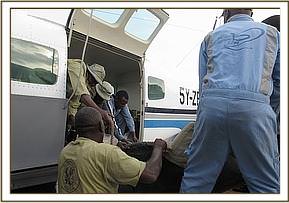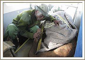 The calf, a female just over a year old, was bruised, dehydrated and weak but still strong enough to put up quite a struggle. Having been overpowered and bound, she was transported in the back of a Pickup to the Trust’s Voi Elephant Stockades, fed water, and spent the night in a Stockade with the other Keeper Dependent orphans nearby, all of whom reached through the separating bars to comfort and touch her. The next day a chartered rescue plane was not available until 2 p.m. so it was only in the late evening of July 8th that she reached the Nairobi Nursery, having been immobilized for the flight. The KWS Vet Dr. Poghon attached to the Trust’s Tsavo Mobile Veterinary Unit was on hand to administer the revival drug, after which the orphan got to its feet. We feared the usual bloating which results from the slowing of the metabolism due to the immobilizing drug, which can put pressure on vital body organs should the calf collapse during the night, thereby compromising survival. Fortunately, however, the new baby managed to survive the night, and began taking milk from a bottle the next morning. We are therefore cautiously optimistic that she will make it.