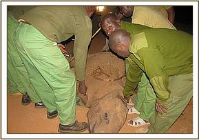 By the time the Team arrived to rescue the orphan, it had retreated into thick bush, so the Trust’s Voi Elephant Keepers were summoned to come and assist. Together they managed to locate and capture the calf during the late afternoon of the 7th July, 2011 with hordes of curious community members watching from afar.