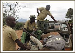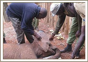 She has been named Kilabasi, the name of a large hill in the area. She will spend several days in the Nursery Taming Stockade before being allowed out to join the others, first having been de-wormed. The arrival of this new orphan brings the number currently in the Nursery to 14, the 3rd orphan elephant to have been brought in during the month of July 2011.