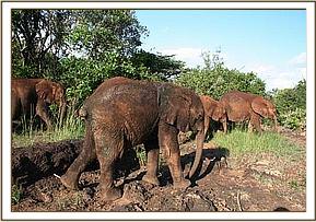 Little “Kilaguni” was a remarkable 6 month old baby in that he was immediately loving to the Keepers, despite the pain of his wounds having to be cleaned and dressed, and the usual prophylactic injections he had to endure from day one. Desperately sucking on their fingers, and desperate for milk and water, there was no hint whatsoever of aggression or fear from the start, which in an elephant of that age is most unusual and usually cause for concern – too calm for comfort, as experience has taught us over the years. His stomach was in a mess so he was put on a course of antibiotics plus the usual Blockers and on day two, he was allowed to join the other Nursery elephants out in the bush, having made friends with Tassia, his next door neighbour at night in the adjoining partition of one of the stockades. We can only assume that having been through such a terrifying ordeal without the protection of his mother or the herd, subsequent events brought comfort and enormous relief to be handled with care and kindness once more, and more importantly find himself not alone in such a strange setting. The input of the other orphans is always what imparts most comfort to any Nursery newcomer.