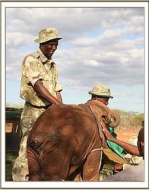 His entire tail had been bitten off, leaving just a swollen stump at the base, with surrounding tooth punctures clearly visible. Bite sized chunks had been taken from both ears, and there were wounds on his back legs, some fairly deep. However, he was in fair physical condition, so had probably only been without his mother for a couple of days, and had probably been beside her body when the hyena turned up to feed on the carcass, the fact that the carcass was there probably the reason why he managed to escape being killed. The reason for his being orphaned is not definitely known, but with the situation as it is today, one would be forgiven for making the assumption that it is likely to be as a result of poaching for ivory. Sadly this is becoming ever more commonplace throughout the country ever since the sale of the Southern African stockpiles, exacerbated by the presence of Chinese road construction workers in the country eager to acquire ivory, plus the down-turn in tourism which has impacted even further on revenue allocated for field operations. Persisting drought conditions following the failure of the long rains and the illegal intrusion of livestock into the Protected Areas competing with wildlife for food and introducing disease is another factor that impacts on the survival of elephants.