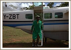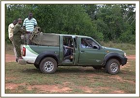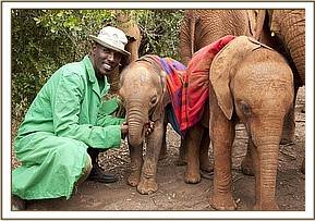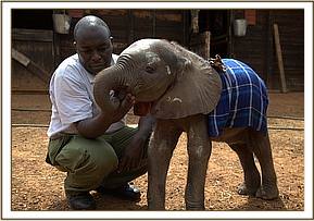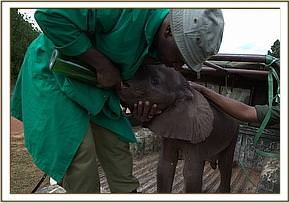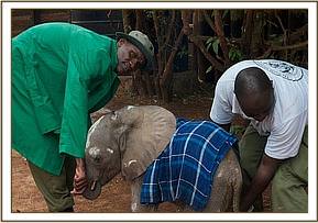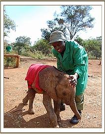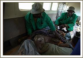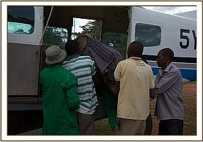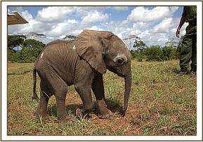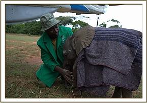 The KWS team under the direction of Warden Philemon Chebet captured the calf immediately and contacted the SWT for further support and to get the baby airlifted to Nairobi. With the onset of nightfall the Nairobi rescue team could not be deployed until the following day, so the calf was cared for at the KWS headquarters over night. The following morning the Assistant Warden and Honoree Warden Mr. Peter Zaneeti met the Nairobi rescue team who arrived to collect the calf and take it into their care.