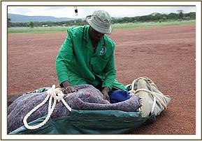 Due to the terrain and dense forest conditions reuniting him with his herd would prove impossible, so we were contacted by the Senior Warden Mount Kenya with the news of a rescue. The calf was transported to the Lewa airfield so that he could be airlifted from there to the Nairobi Nursery, arriving in torrential rain, well after dark.