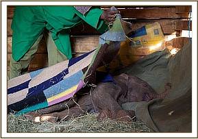 This baby is tiny, no more than, and possibly even less, than a week old on arrival, the hind side of the ears soft and petal pink and the umbilicus newly detached. We hope that he has been able to ingest her first Colostrum milk to trigger his natural immune system. He has been named Kithaka the Meru word for forest. He is a real character, larger than life and full of attitude and, of course, is absolutely adored by the older orphans in the Nursery.